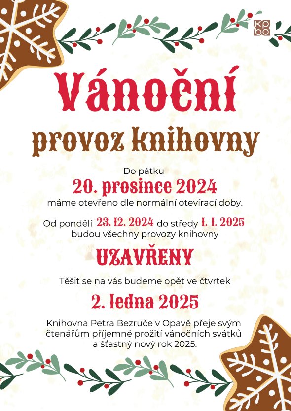 Posledním půjčovním dnem v tomto roce dle normální otevírací doby bude pátek 20. prosince 2024. Od pondělí 23. prosince 2024 do středy 1. 1. 2025 pak budou všechny provozy knihovny uzavřeny.