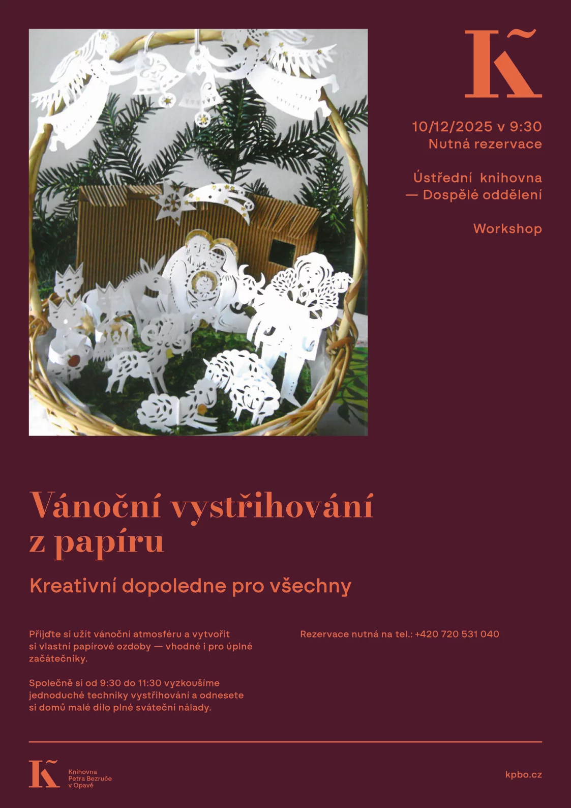 Tvořivé dopoledne pro dospělé. Přijďte si užít vánoční atmosféru a vytvořit si vlastní papírové ozdoby – vhodné i pro úplné začátečníky. Společně si vyzkoušíme jednoduché techniky vystřihování a odnesete si domů malé dílo plné sváteční nálady.